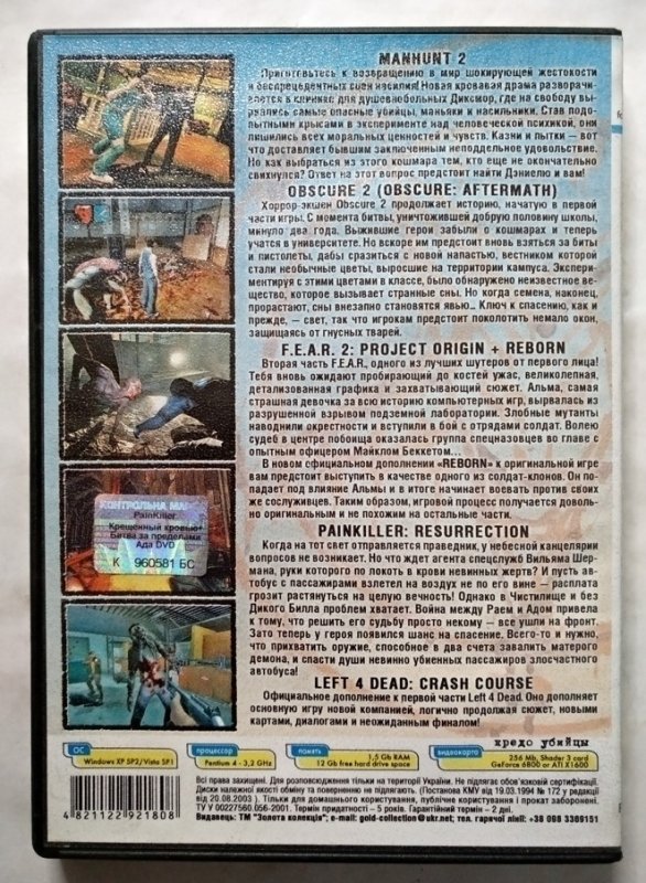 Игровой диск Obscure, Manhunt 2, Fear 2, Painkiller купить в Киеве.